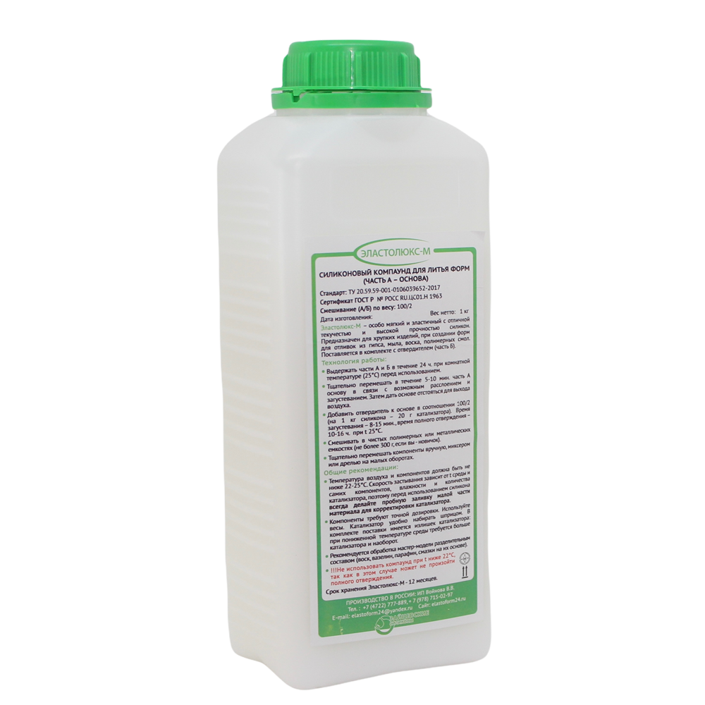 Силиконовый компаунд Эластолюкс-М отличается особой мягкостью и эластичностью, отличная текучесть (нет пузырей!) и высокая прочность! Идеально подходит для хрупких изделий. Растяжение - 600%. Для мягких силиконовых форм для свечей, мыла, гипса, пластики.   Очень мягкий и эластичный (мягкость по Шору А 10, растяжение 600%). Силикон текучий и высокопрочный Идеален для хрупких отливок при изготовлении очень мягких и эластичных форм, позволяющих извлекать отливки без повреждений. Компаунд заливочный Эластолюкс-М предназначен для  изготовления любых сложных форм с отрицательными углами. Отличается высокой прочностью.  Выпускается в белом цвете. Легко окрашивается в любой желаемый цвет с помощью красителей. Поставляется в комплекте с отвердителем, цена приводится за комплект.