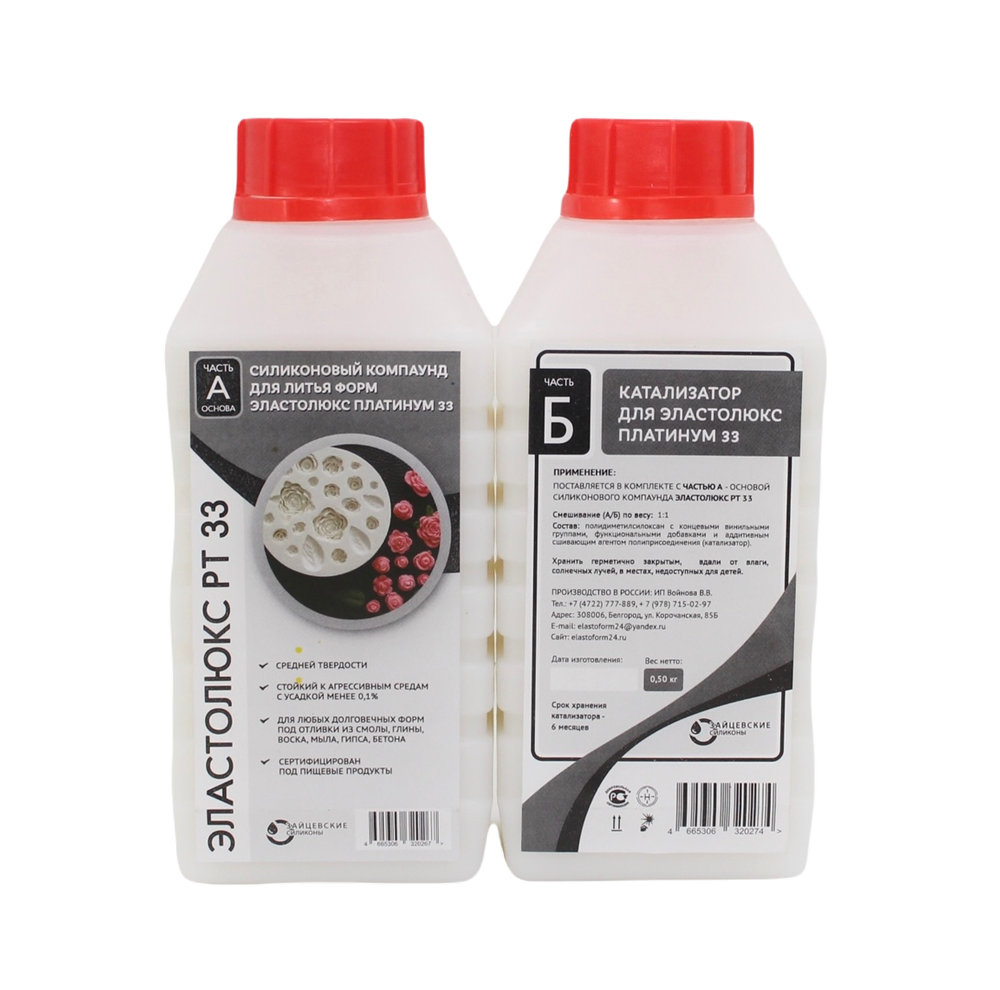 Платиновый силикон Эластолюкс Платинум 33 ― безусадочный, стойкий и нетоксичный силикон для форм с повышенной твердостью. Является пищевым силиконом. При работе с пластиками нужна разделительная смазка. Данный платиновый силикон идеален для пищевых продуктов. Выходят все пузыри даже без использования вакуумной камеры. Силикон на платиновом катализаторе применяется там, где важны отсутствие запаха (для пищевых продуктов), безусадочность (при изготовлении больших изделий), стойкость к агрессивным средам (для полиуретанов, пластиков, для щелочей, полиэфирных, эпоксидных и других смол). Платиновый силикон Эластолюкс Платинум предназначен для изготовления любых сложных высокоэластичных долговечных форм: для искусственных камней, мыла, свечей, смол, гипса, парафинов, полимерной глины и пищевых продуктов, мастики и вайнеров. Платиновый силикон подходит также для форм под шарнирные куклы, для производства вайнеров (штамповка глины, керамическая флористика и т.д.).Технология работы с платиновым силиконом: